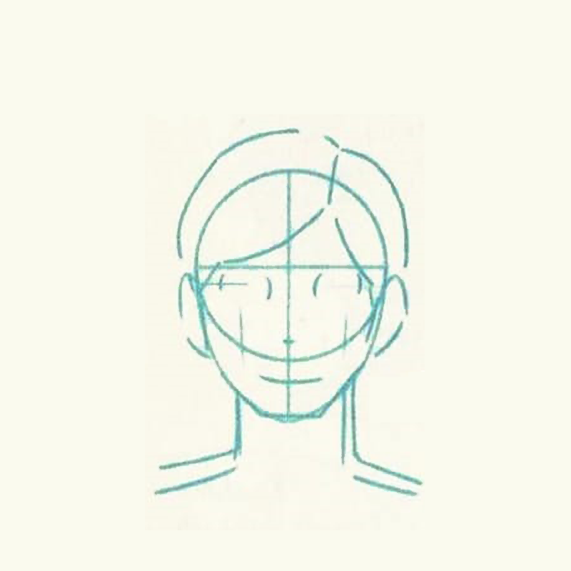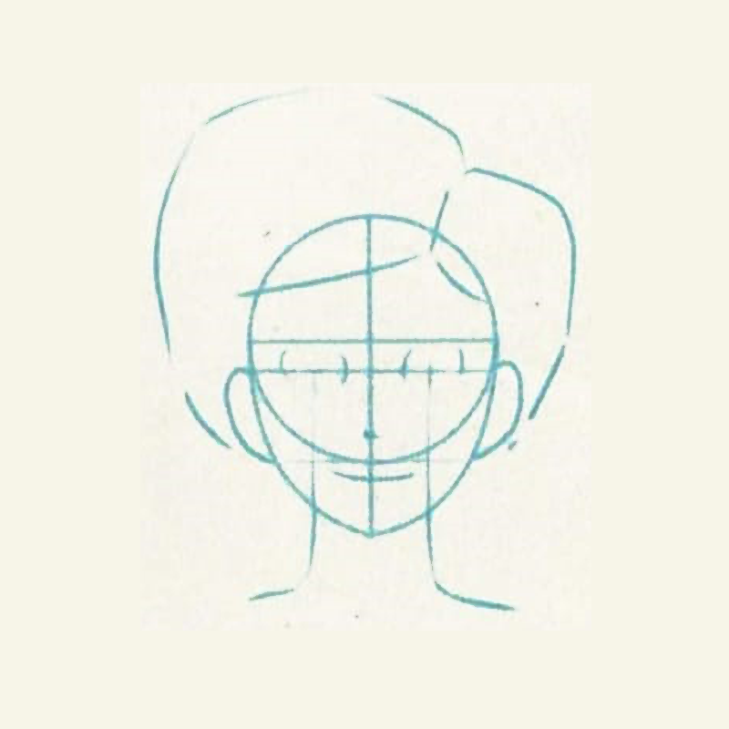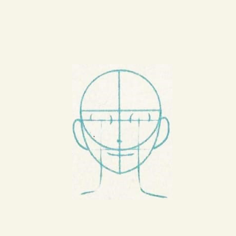 - Mark the position of the eyes, nose and lips. Add the ears and the neck bulge in relation to eyes.